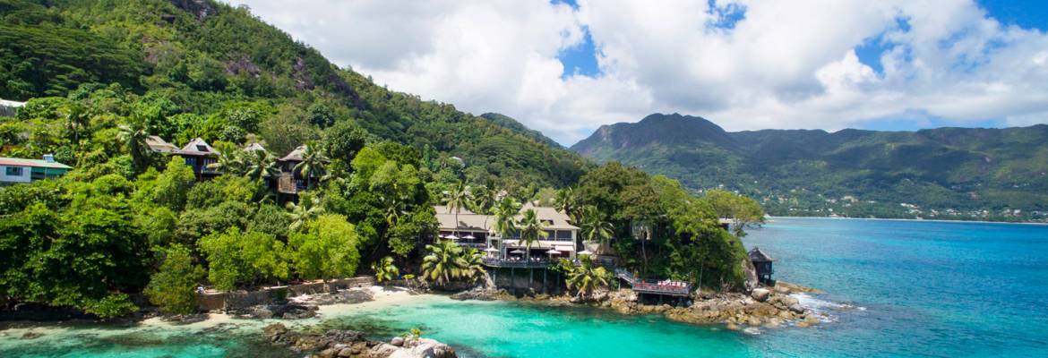 Cluster of Seychellois villas perched on stilts for the best views of Beau Vallon bay.