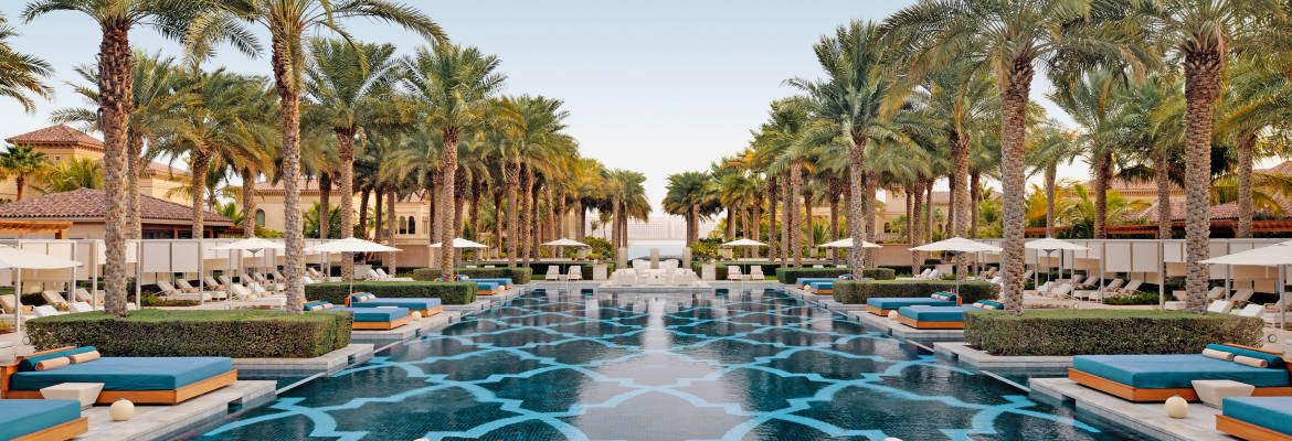 Encompassed by the glistening waters of the Arabian Gulf on the pristine sands of the world-famous Palm Jumeirah island, this intimate resort is a secluded haven of luxury. It has stunning views of the Dubai skyline in the distance and is filled with fountains, sparkling pools and lush gardens.