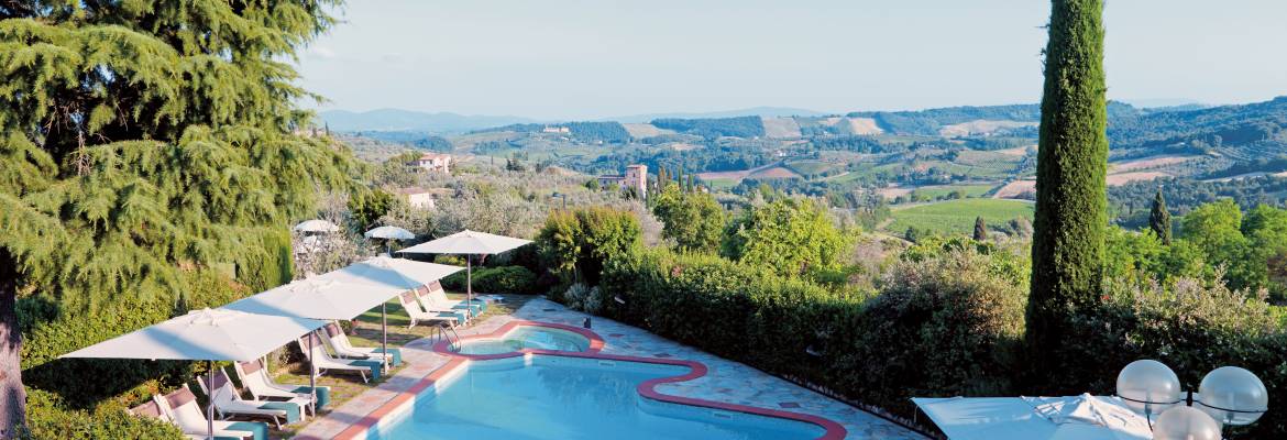 Nestled in beautiful gardens sprinkled with cypress and olive trees, this delightful hotel is just a ten-minute gentle uphill stroll from the UNESCO-listed medieval walls of San Gimignano. It is perfectly placed for local exploration yet far enough away from the town to provide a peaceful countryside escape. Relax under the shade of a parasol on one of the sunloungers that are dotted on the lawn and around the shell-shaped pool, or slip into the hydro-massage pool and soak up the serenity and the mesmerising views over the countryside. The views are quintessential Tuscany – a picture-perfect landscape of endless rolling hills, olive groves and a patchwork of fields and vineyards dotted with medieval towers.